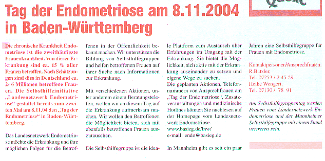 Rückblick auf den 1. "Tag der Endometriose" am 08.11.2003