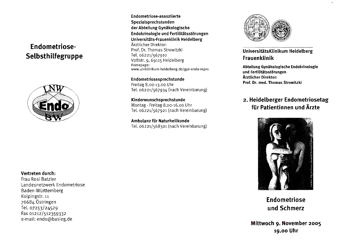 Vortragsveranstaltung der Frauenklinik Heidelberg in Kooperation mit dem Landesnetzwerk Endometriose in Baden-Württemberg Thema: Endometriose und Schmerz Schmerz eines der Hauptleitsymptome bei der Erkrankung Endometriose. Verschiedene Vorträge sollen mögliche Behandlungsstrategien der Schmerzen bei Endometriose aufzeigen. Die Vorträge sind aus dem Bereich der Schulmedizin, der Schmerzambulanz, der Naturheilkunde und der Selbsthilfe. |