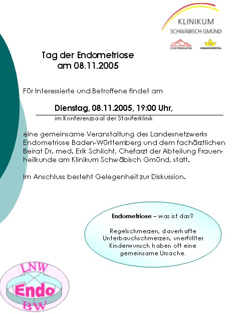 Vortragsveranstaltung für Betroffene und Interessierte Thema: Endometriose- Was ist das? Regelschmerzen, dauerhafte Unterbauchschmerzen, unerfüllter Kinderwunsch haben oft eine gemeinsame Ursache. Im Anschluss besteht die Möglichkeit Fragen zu stellen , ferner ist die Gründung einer Selbsthilfegruppe in Mutlangen geplant. weitere Infos siehe Plakat |